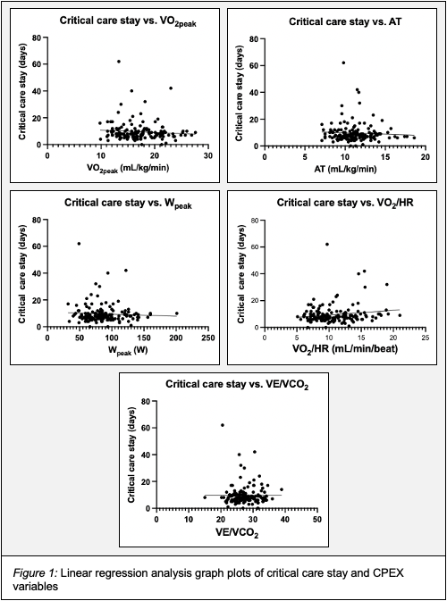 Methods: A single centre retrospective analysis of patients that underwent SKP transplant at Edinburgh Transplant Centre between 2011 and 2020 was carried out. Patients were included if they had performed at least one CPEX prior to surgery and if their results were available. Five CPEX variables were included in the study (peak oxygen consumption (VO2peak), anaerobic threshold (AT), peak workload (Wpeak), oxygen pulse (VO2/HR), ventilatory equivalent for carbon dioxide (VE/VCO2)). The primary outcome was the length of postoperative critical care unit stay. Additional data was collected for length of hospitalisation, mortality and graft outcomes.