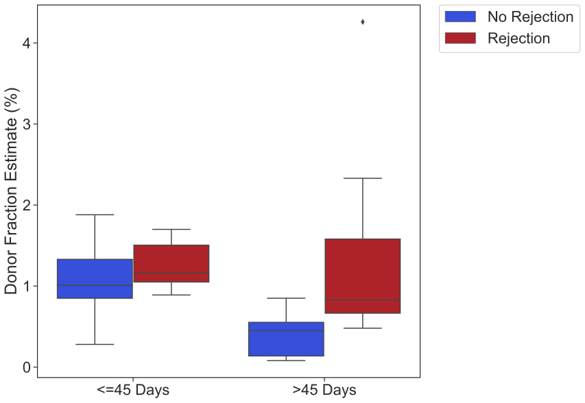 Results: Plasma samples (n=50) were obtained from 37 SPK recipients. Pancreas biopsies were collected from 30 patients. Of the 50 plasma samples, 36 were plasma-biopsy paired and per Banff criteria were categorized as no rejection (n=21) and acute rejection (aTCMR and aABMR; n=15). Median dd-cfDNA levels were significantly elevated in samples with graft rejection diagnosis: 1.11 [0.83-1.66] vs. no rejection 0.65 [0.28-1.00]; p=0.004),especially after 45 days post transplantation (AR: 0.83[0.67-1.59], NR:0.45[0.13-0.55], p=0.004) (Figure 1). The overall performance of the test after 45 days of transplant is as follows: sensitivity 71.4%, specificity 91.6%, PPV: 83.8%, NPV:84.6%.
