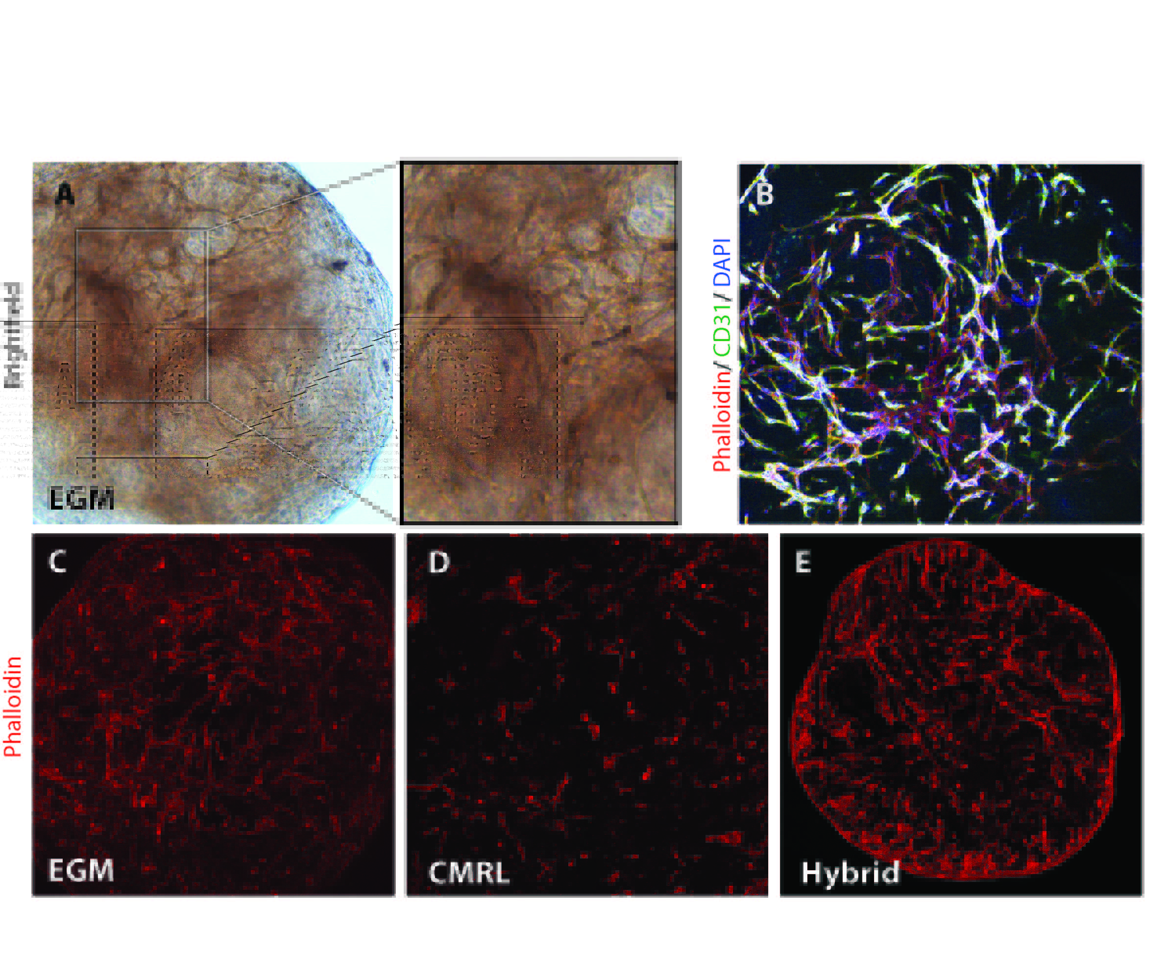 Results: ECs cultured in hP-HG in EC growth medium (EGM) formed 3D tubes covering 29% of the area of a max-intensity image (Fig 1C). When cultured in islet medium (CMRL), the percentage was reduced (14.2%) (Fig 1D), but when cultured in a hybrid medium combining EC and islet media, the vessel coverage was 31.7% (Fig 1E). The combination of these media and methods enables the co-culture of endothelial tubes with islets in hP-HG for several days.