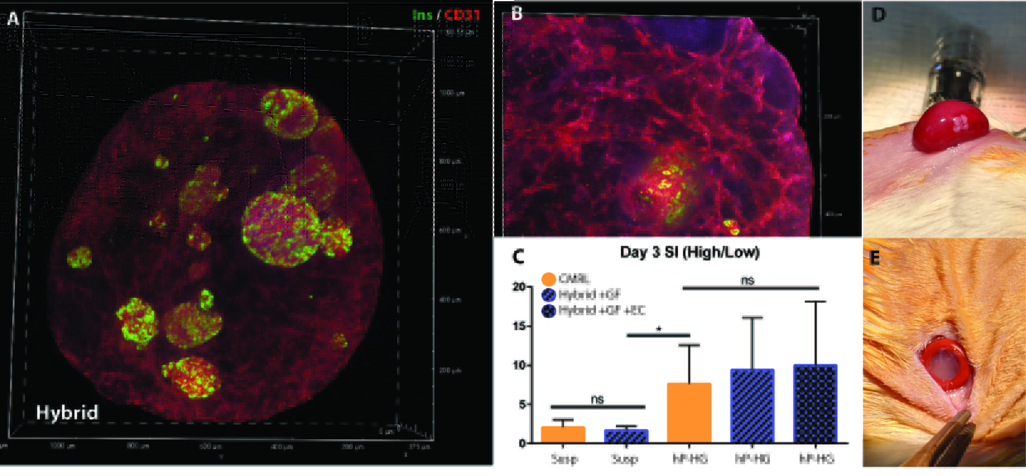 Islets cultured in hP-HG alone had a significantly improved stimulation index (SI = 7.6) compared to the same donor islets cultured in suspension (SI = 2.1). Islets cultured in medium with EC growth factors with or without added ECs had a stimulation index comparable to that of islets in hP-HG alone (SI = 10.0). (Fig 2C) The gel constructs can easily be transplanted into the kidney capsule (Fig 2D) or subcutaneously (Fig 2E).