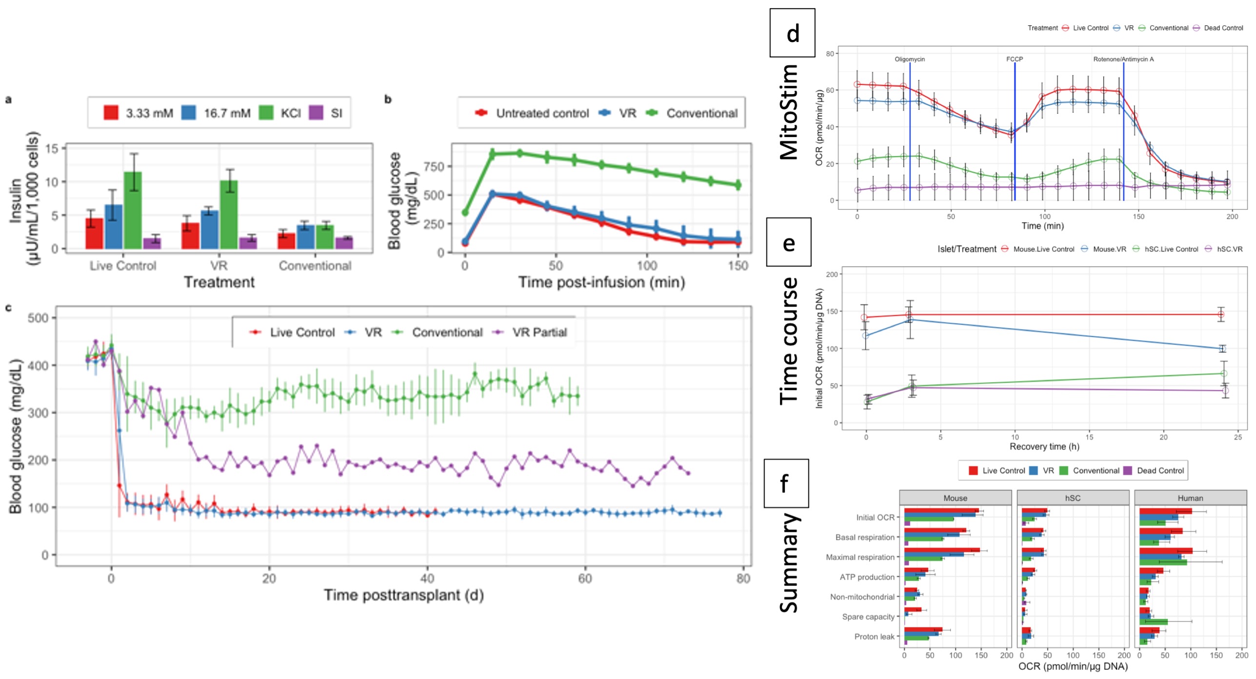 Results: Following rewarming, three-hour recovery in a dynamic spinner flask with culture media at 5% CO2 was essential. Viability of 91% was achieved with VR, compared to 59% using conventional cryopreservation methods. ATP content, mitochondrial reactivation, OCR, GSIS demonstrated significant difference compared to conventional cryopreservation in all 4 species. Brightfield and TEM imaging show well preserved cellular architecture. 9/10 VR transplants (250 islets) normalized BG in 48h with tight control of BG thereafter for >100 days with acceptable responses to glucose stress tests, while insulin production of pig & HSc VR xenografts were comparable to control xenotransplants.