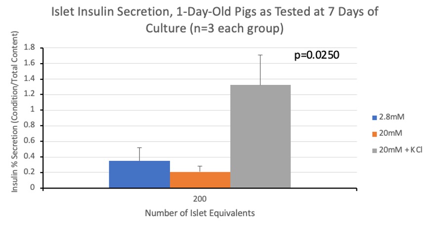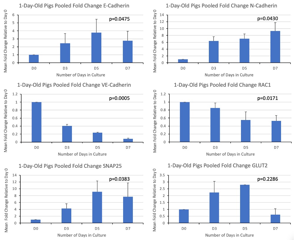 Method: Islets from 1-day-old pigs (n=3) were isolated and samples collected on days 0, 3, 5 and 7 of culture to quantify GLUT2, SNAP25, RAC1, E-, N- and VE-cadherin gene expression by qRT-PCR. Immunofluorescence staining was performed to localize protein expression. Static glucose stimulation insulin secretion assays (GSIS) and ELISA were used to quantify the ability of these islets to secrete insulin under conditions containing low glucose, high glucose and high glucose with KCl. Kruskal-Wallis testing was completed with GraphPad Prism software.