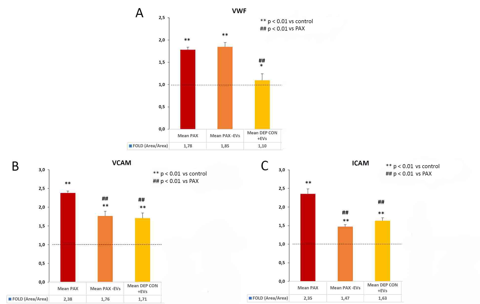 Results: the expression of ED markers (vWF, VCAM-1 and ICAM-1) in cells exposed to patient serum (with or without EVs) was higher compared to that observed after exposure to control sera (vWF, p <0.01; Fig. 1A; VCAM-1, p <0.01; Fig. 1B; ICAM-1, p <0.01; Fig. 1C). Moreover, EVs depletion significantly decreases the expression of VCAM-1 and ICAM- 1 with respect to the patient's serum (Fig. 1B, p <0.01 and 1C, p <0.01), but not vWF expression.