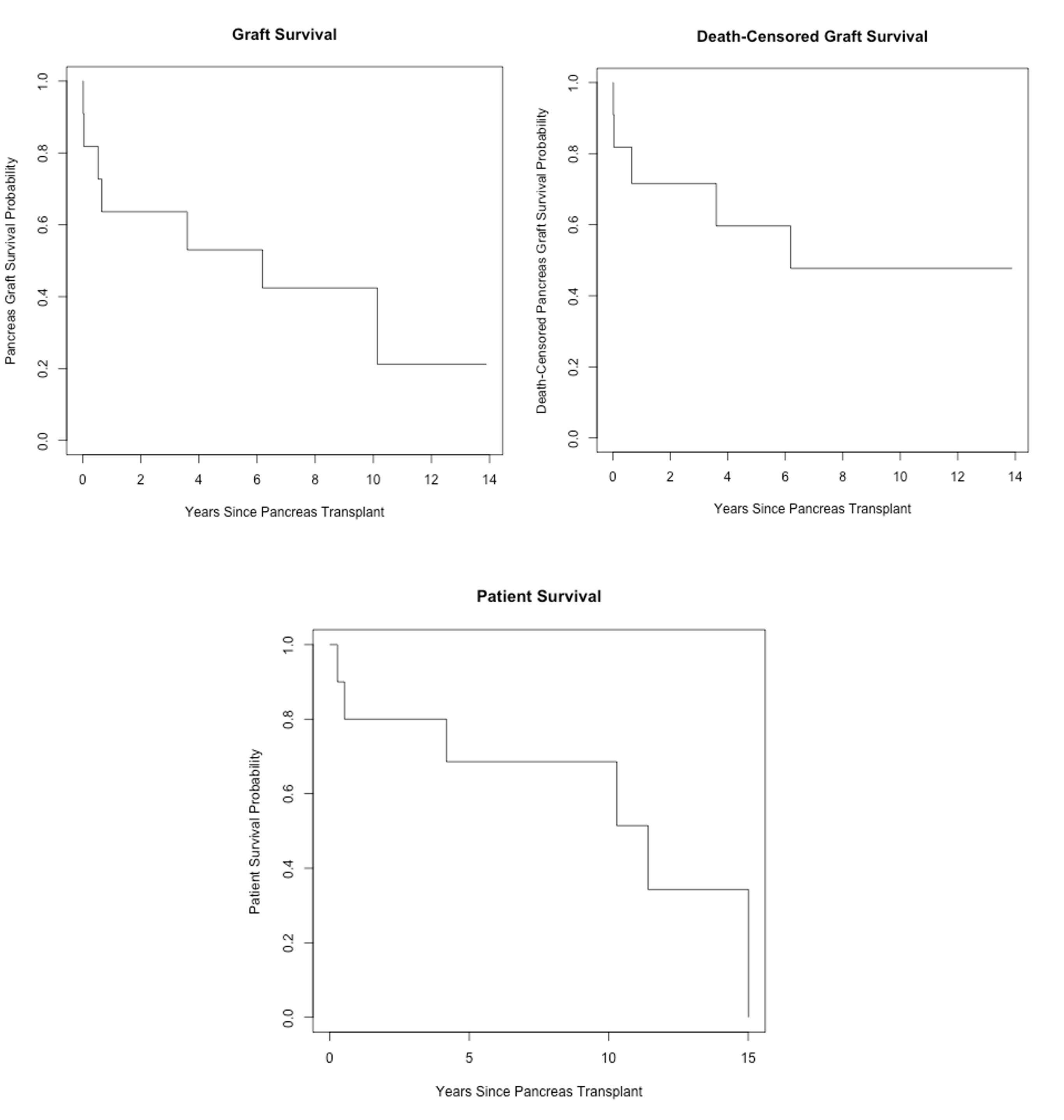 Methods: Using hospital-based records and SRTR database, Chronic Pancreatitis (CP) patients from 1977 to 2008 following TPIAT who developed hypoglycemic unawareness with graft failure and underwent a PTA were included in this study. Recipients of PTA following only TP were excluded from the study. Kaplan Meier (KM) curves for graft survival, death-censored graft survival and patient survival following PTA were plotted. Demographics, etiology of CP, intra-operative notes, post-operative complications, glycemic control/ graft function (HbA1c, c-peptide, hypoglycemic unawareness), rejection episodes and cause of death were documented.