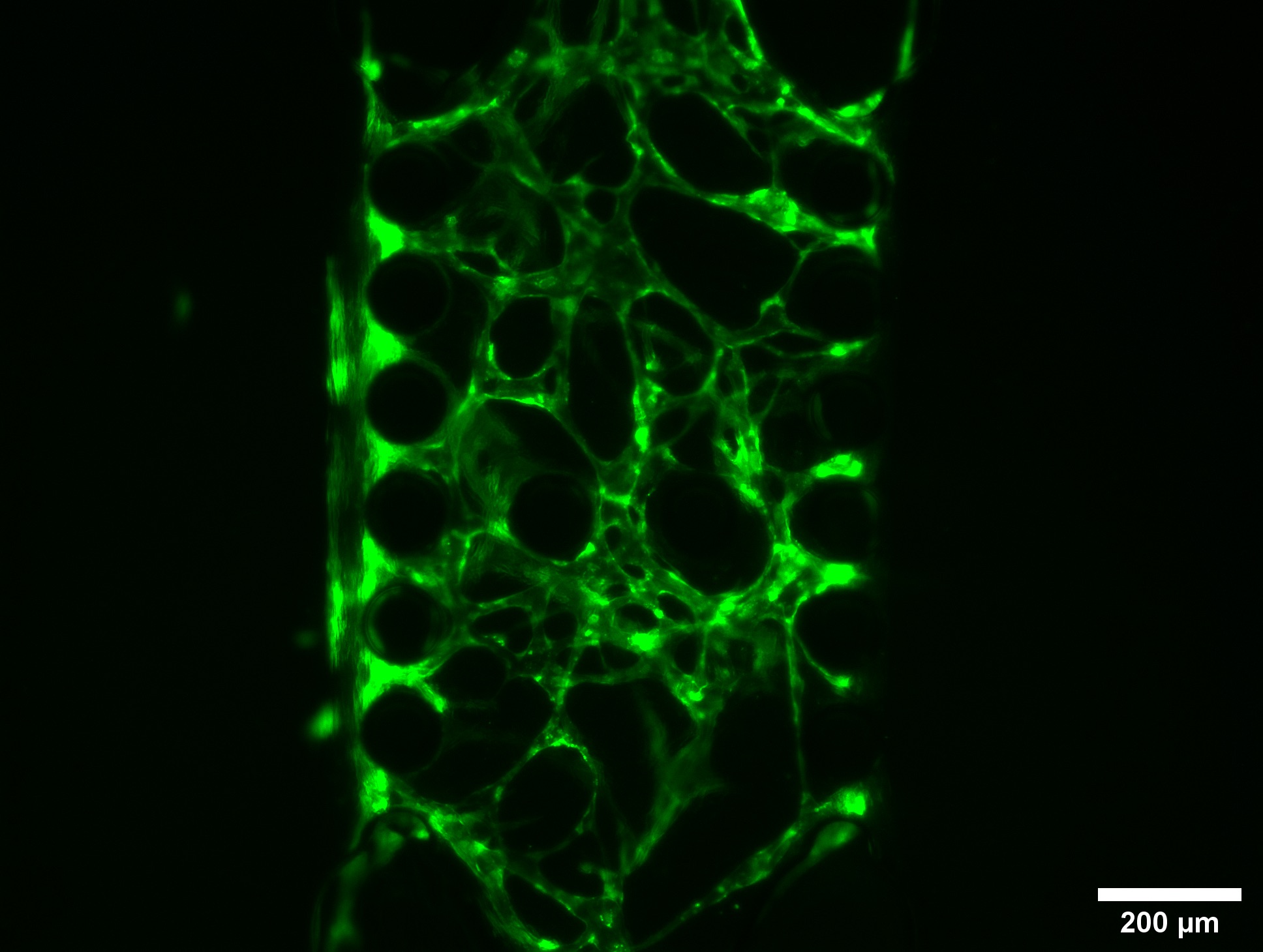 We created a specific microfluidic chip in which endothelialized Langerhanoids (or pseudo-islets) produced off-line are embedded in a finely controlled microenvironment with favorable conditions for vascularization, perfusion and long-term production of insulin. A key parameter for long-term stability is the quality of the endothelial network.