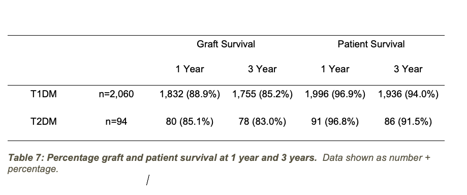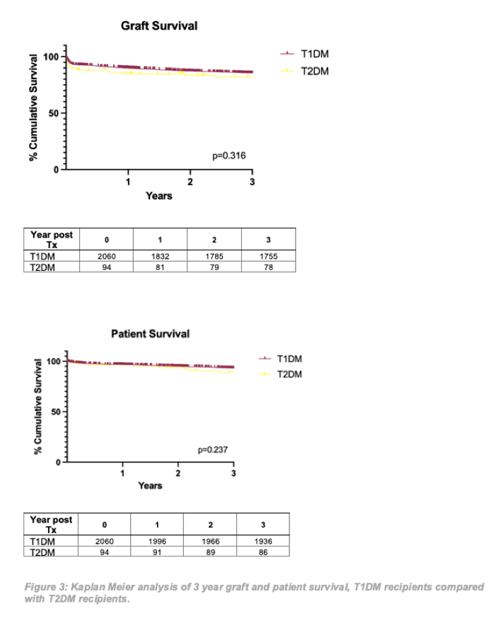 Results: The majority of SPK transplants were performed in recipients with T1DM (95.6%, n=2,060), and  3.4% (n=94) were performed in recipients with T2DM. Recipients with T2DM were statistically significantly more likely to be older (p<0.0001), male (p<0.0001), with a higher body mass index (BMI) (p=0.0191) and not requiring dialysis (p<0.0001). Univariate analysis showed no statistically significant difference in graft (GS) or patient (PS) survival between recipients with T1DM or T2DM at 1 year (GS T1DM-88.9%, T2DM-85.1% p=0.120; PS T1DM-96.9% T2DM-96.8%, p=0.886) or 3 years (GS T1DM-85.2% T2DM-83.0%, p=0.316; PS T1DM-96.9%, T2DM-96.8% p=0.237). Multi-variate analysis also failed to reveal a statistically significant difference between graft (p=0.564, HR 1.221, 95%CI 0.619, 2.406) or patient (p=0.556, HR 1.280, 95%CI 0.563, 2.911) survival between these two cohorts. Common complications after pancreas transplant such as myocardial infarction, cerebrovascular accident, infection and rejection were analysed and again no statistically significant differences were seen between recipients regardless of type of diabetes.