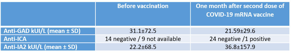 Results: Overall, we did not identify major signs of inflammation. Seven patients showed elevated D-dimer after vaccination. In 12 patients, there was complement factor 3 consumption without signs of inflammation. Mean serum CRP was 4.05±2.12 mg/L. There were no significant changes in blood count, haptoglobin, and LDH, ruling out intravascular hemolysis. The comparison of islet autoantibodies titre before and after vaccination did not reveal any consistent autoimmune re-activation (Table 1).